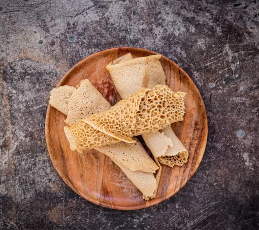 Crispy grilled injera served with spiced cottage cheese, topped with seasoned butter.